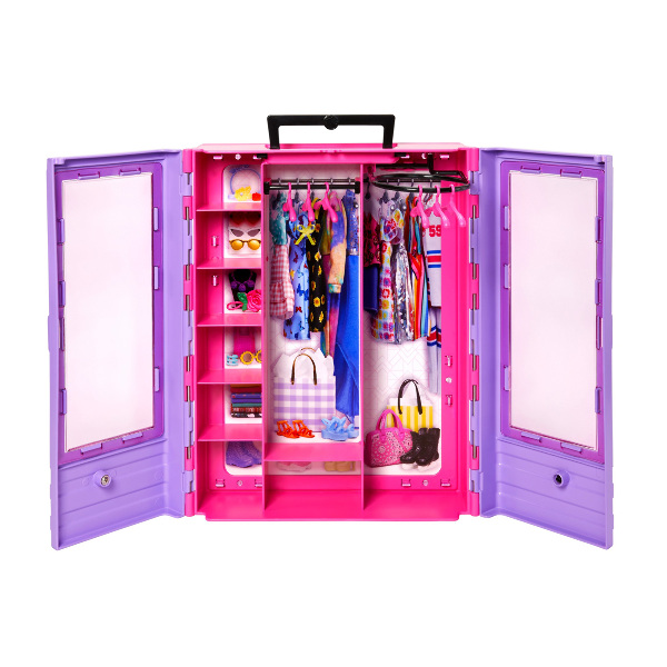 スタイリッシュなクローゼットは15種類以上のファッションとアクセサリーがセットになっていて、様々なコーディネートが楽しめます。いくつもの収納スペースがあり、衣類ラックは折りたたんで収納することもできます。お家で遊ぶのはもちろん、お出かけにも簡単に持っていけます。ハンガー6本、ファッション3点、ネックレス2点、財布2点、靴3点がセットに含まれます。