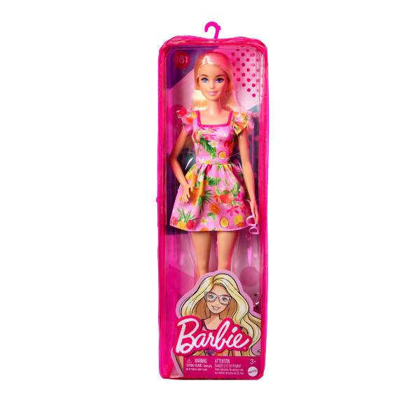 袖がフリルになったキュートなフルーツ柄のドレスを着たドールです。オレンジのプラットフォームヒールとピンクのメガネがこのコーディネートにさらに魅力をそえています。ブロンドの髪は、ソフトでモダンなスタイリングです。