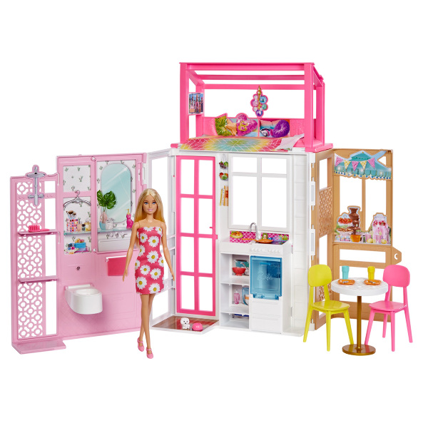 360度遊べるこのセットは、モダンなデザインで、バービーと彼女の愛らしいペットの子犬を含め、お子さまがごっこ遊びを楽しむのに必要なものが十分にそろっています。360度の遊び、2階建て、4つのプレイエリア(ロフトベッド、バスルーム、キッチン、ダイニングルーム)があり、カラフルでバービーらしいデザインが特徴です。遊び終わったら、セット全体を折りたたんで簡単に片付けられ、外出先にも持ち運びが可能。お子さまへのギフトに最適です。プラスチック製のドールハウスなので耐久性があり長くお子さまに楽しんでいただけます。      玄関で友だちを迎え、キッチンで楽しく料理をして、2人掛けのダイニングテーブルで食事をしたり、ドールをロフトベッドに寝かせて、心地よい眠りを楽しませることもできます。愛らしいペットの子犬、楽しい家具やアクセサリーがお子さまの想像の世界を広げてくれます。